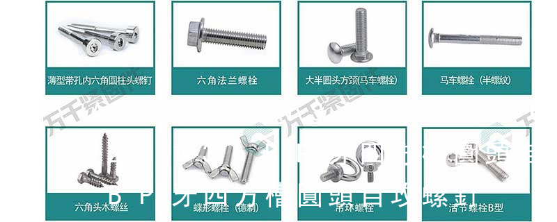 外六角螺栓、內六角螺栓、馬車螺栓、膨脹螺栓、對鎖螺栓、U型螺栓、自攻螺釘、機械螺釘、緊定螺釘、螺柱、牙條、六角螺帽、尼龍螺帽、金屬鎖緊螺帽、四方螺帽、薄螺帽、蓋型螺帽、蝶型螺帽、法蘭面螺帽、鉚螺帽、圓螺帽、吊環 6. 木螺釘:也是與機器螺釘相似,但螺桿上的螺紋為專用的木螺釘用羅紋,可以直接旋入木質構件(或零件)中,用于把一個帶通孔的金屬(或非金屬)零件與一個木質構件緊固連接在一起。這種連接也是屬于可以拆卸連接。7. 墊圈